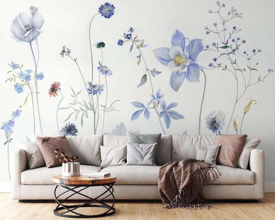 Questa carta da parati presenta una composizione di fiori botanici nei toni del blu, con dettagli raffinati che evocano un'illustrazione elegante e contemporanea. La disposizione degli elementi crea una prospettiva leggera che dona profondità visiva e armonia. Le tonalità di blu si intrecciano con sfumature più chiare, costruendo un equilibrio cromatico sofisticato e rilassante. L'atmosfera è fresca e raffinata, capace di trasmettere calma e stile. Questo fotomurale è perfetto per soggiorni moderni, camere da letto eleganti o spazi in stile minimal, trasformando l'ambiente con un tocco botanico distintivo.